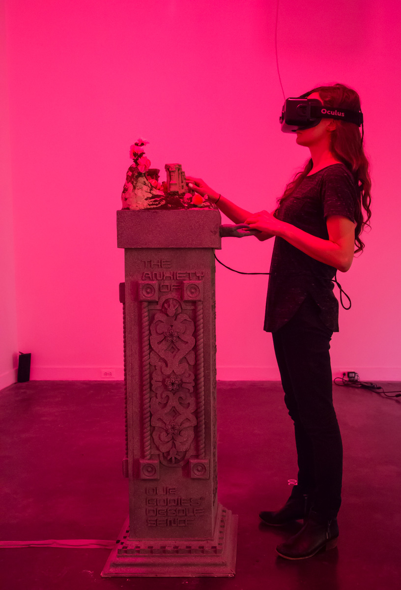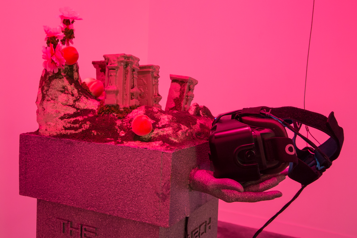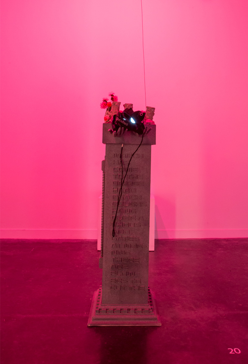 Riffing on tropes of techno-Orientalism to create an updated, eroticized space of cultural fluidity, this piece takes its title from the ancient Chinese political text Peach Blossom Shangri-La. Sections of verse from Ezra Pound’s translation of Chinese classical poetry, Cathay, are appropriated/decolonized. Oliver Laric’s Yuanmingyuan 3D Scan plinths are themselves 3D printed, in miniature, to become the controllers that navigate the installation space. These plinths have an interesting backstory. Originally looted from the Yuan Ming Yuan gardens in China, they were donated to the Norwegian KODE Museum. Recently, a Chinese tycoon donated a large sum of money in exchange for the plinths to be “gifted” back to China, causing much controversy since under international law China technically owns the plinths. Laric’s making the plinth designs available for free download is thus a symbolic gesture of protest. Our reappropriation adds another layer to the cultural ownership discourse.