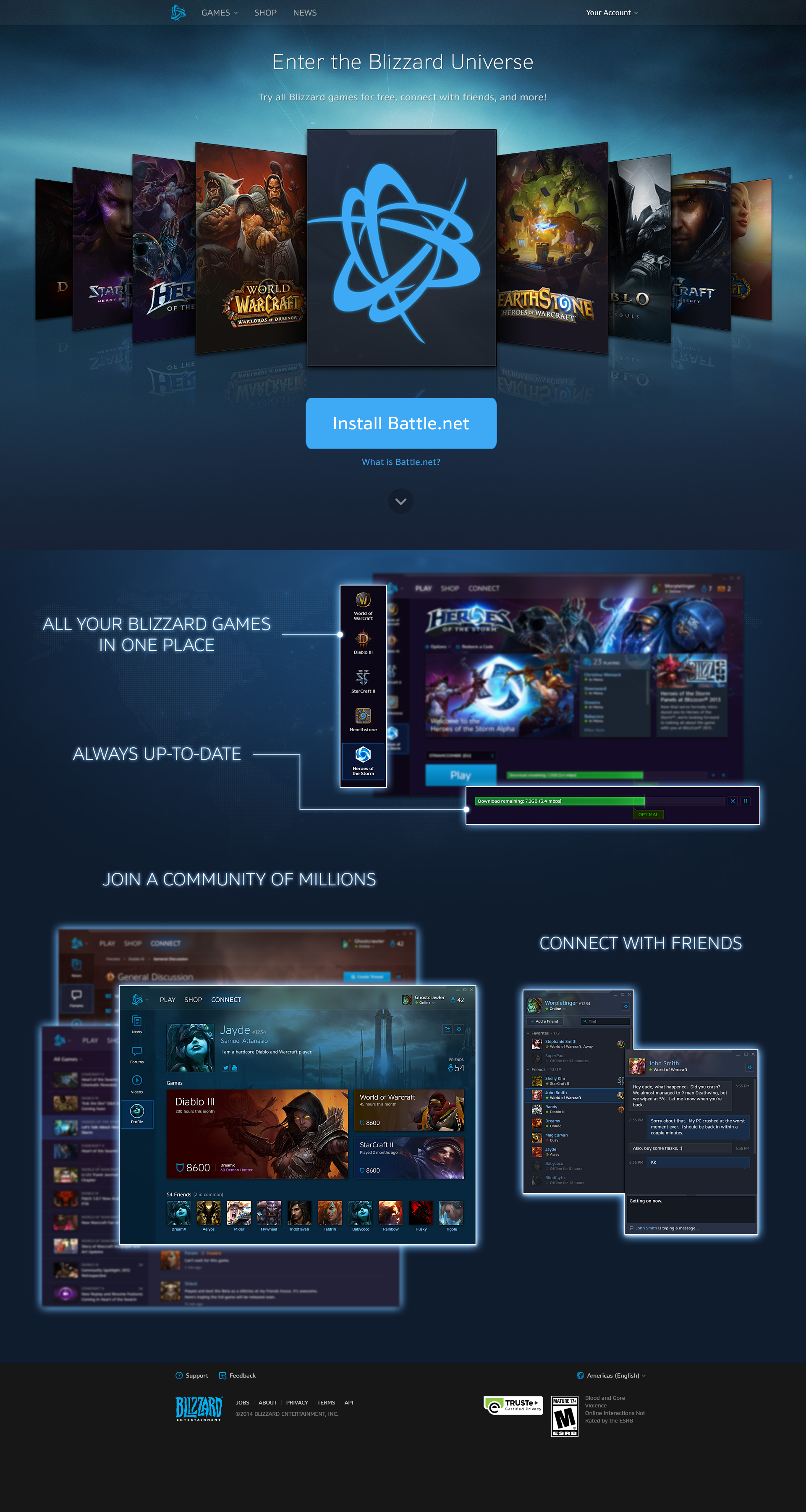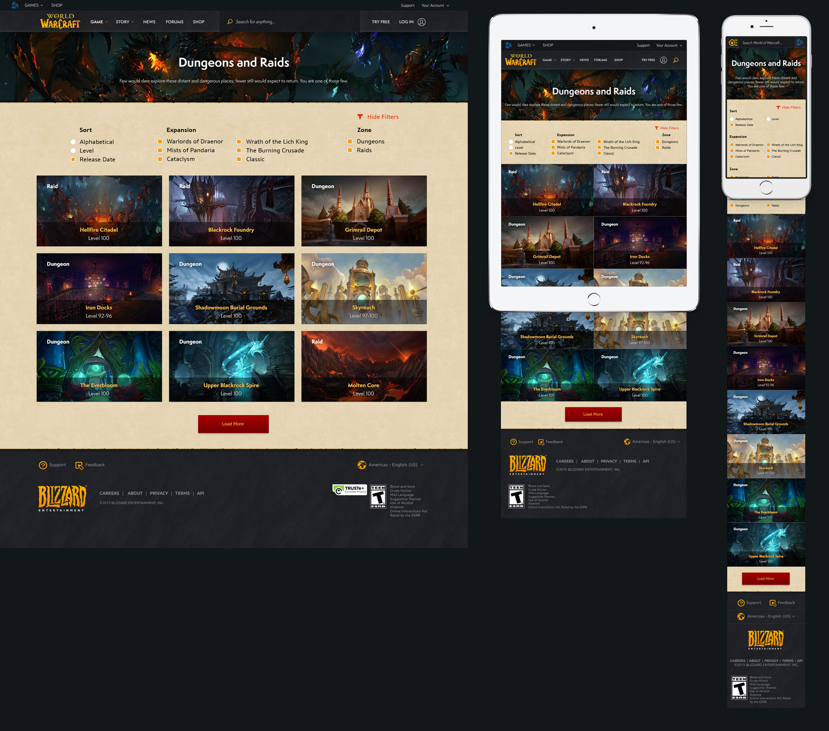 Working closely with engineers early on to determine what content could be displayed was a communication task that I learned was vital to page designs. In WoW's case, I prototyped a collection of every dungeon and raid in the game with helpful information such as zoning, boss mechanics, loot drops, and other media. In regards to redesigning the battle.net homepage, I had a different set of challenges to overcome, such as how to support more new game titles from a scalability perspective and how to show key features of the desktop application.