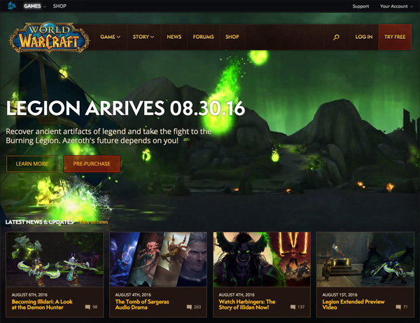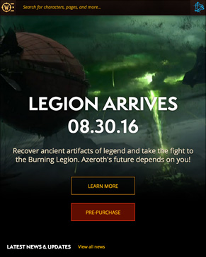 Colors and textures pay tribute to the game style and legacy website. Modular tiles make the website more configurable and provides a modern feel. Video backgrounds on the homepage will easily support all future expansion releases. The design of the World of Warcraft website has been updated for the foreseeable future.